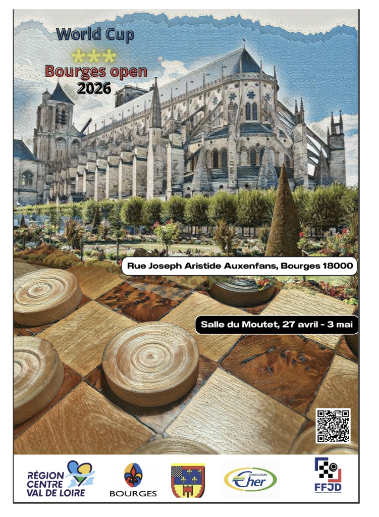 L’Amicale Damiste du Cher organise, entre le 22 et le 27 avril 2025, dans la salle du Moutet, rue Aristide Joseph Auxenfans à Bourges, son 2ème OPEN INTERNATIONAL sous le régime d’une WORLD CUP ***. Cette compétition de jeu de dames, sur damier de 100 cases, se déroulera en système suisse, à la cadence de 1h20 + 1 minute par coup.